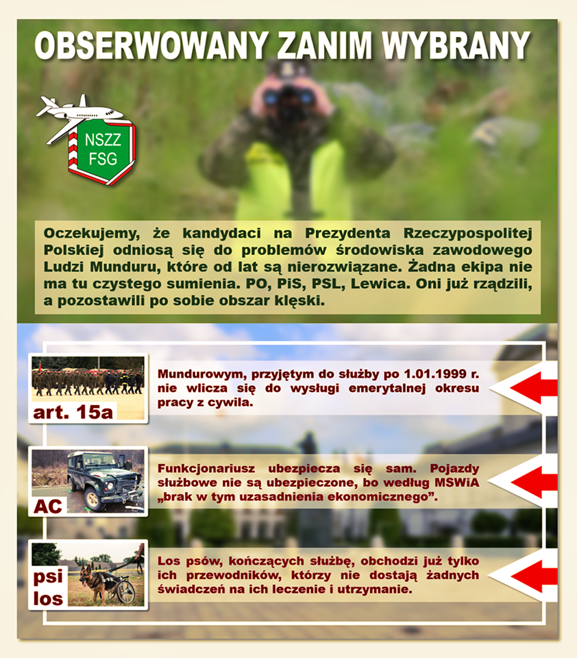 Całkiem niedawno o służących w Straży Granicznej przypominali przedstawiciele Niezależnego Samorządnego Związku Zawodowego Funkcjonariuszy Straży Granicznej przy Nadwiślańskim Oddziale SG, jako jednym z nierozwiązanych problemów formacji. Chodzi mianowicie o to, że po zakończeniu “pracy” nie otrzymują one emerytur. Związkowcy oczekiwali, że do sprawy tej odniosą się kandydaci na prezydenta Polski.